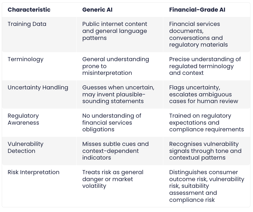 Generic AI is powerful, although financial services requires precision. A misinterpreted sentence or incorrect explanation can lead to customer harm or regulatory intervention.