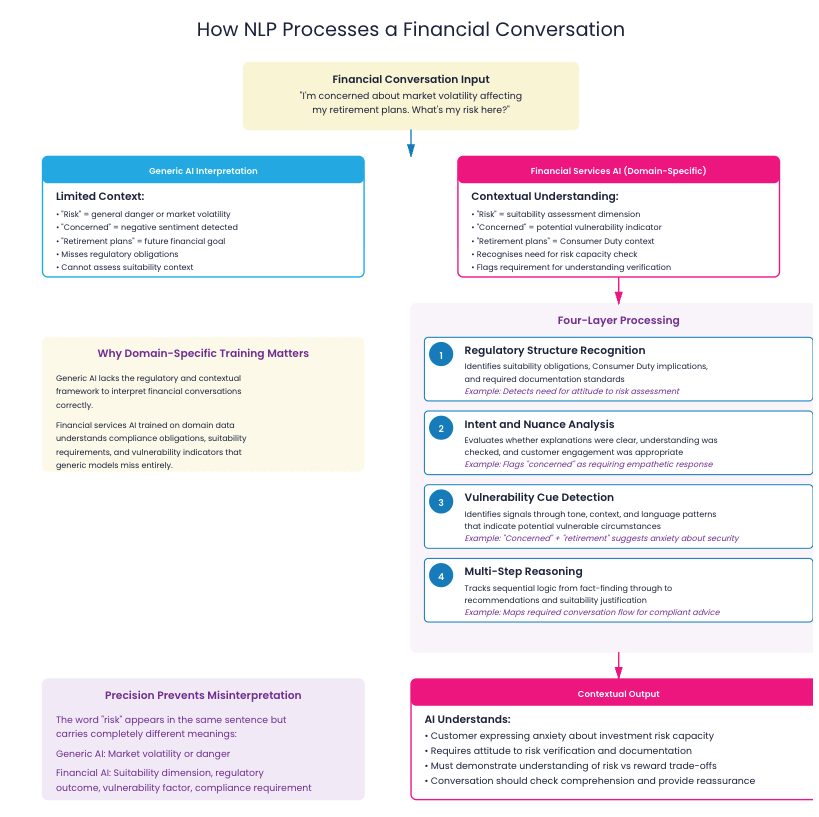 Financial language carries regulatory weight. Words and phrasing signal obligations, explanation quality and evidence. AI must be trained on these norms to interpret them correctly.