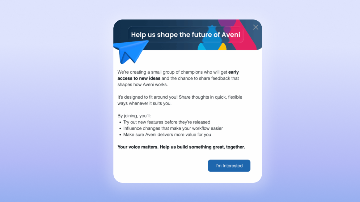 A: I’d say it’s a great opportunity to have a real influence on the product you use every day. As a Champion, your feedback doesn’t disappear into a void, it directly shapes how Aveni Assist evolves. It’s also a chance to share your perspective, learn about what’s coming next, and make sure the tools you rely on are built with your real needs in mind.