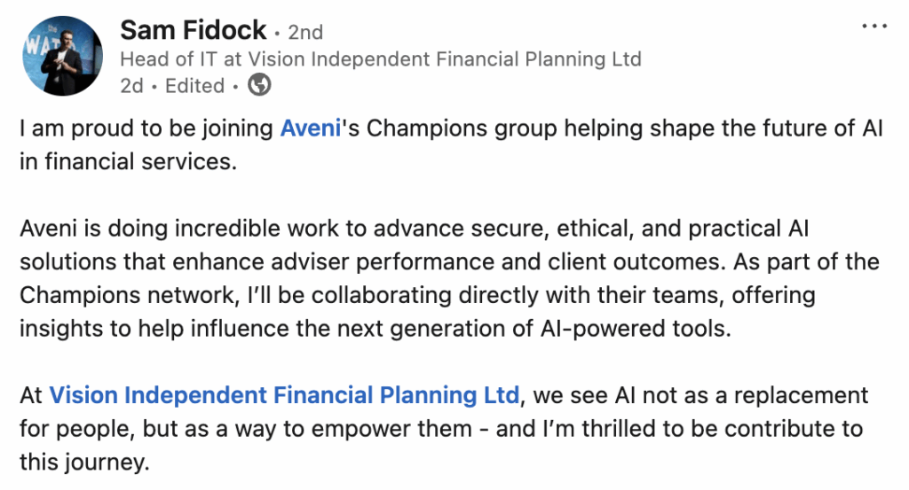 Aveni’s Champions Network represents a commitment: real collaboration with the people who rely on our tools. This is not product research. It is co-creation. The strongest systems in financial services will be those shaped by lived experience, not assumptions.
