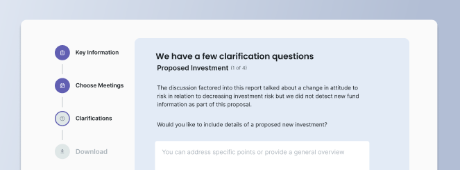 When the AI detects unclear or incomplete information, it does not guess. It raises a targeted prompt for the adviser to confirm or clarify.