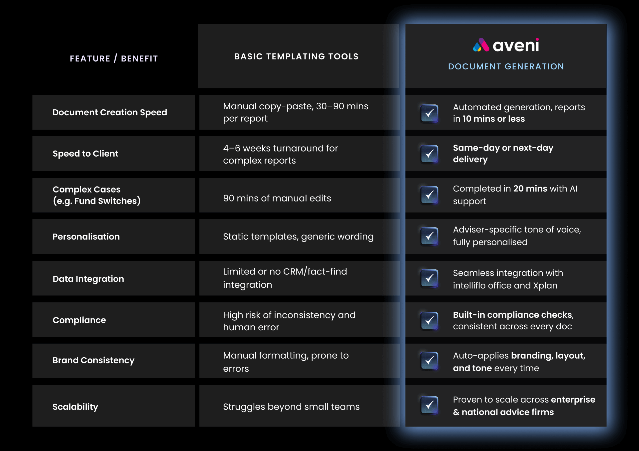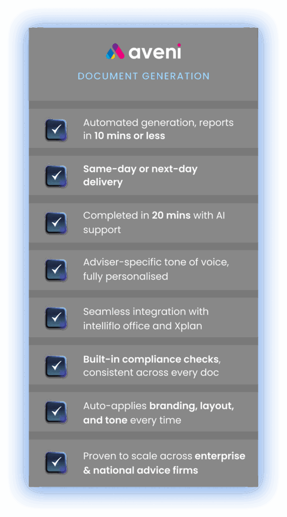 Move beyond clunky templating tools. Aveni Assit’s AI-powered Document Generation is built for financial advisers, enabling personalised, compliant, and on-brand documents at scale.