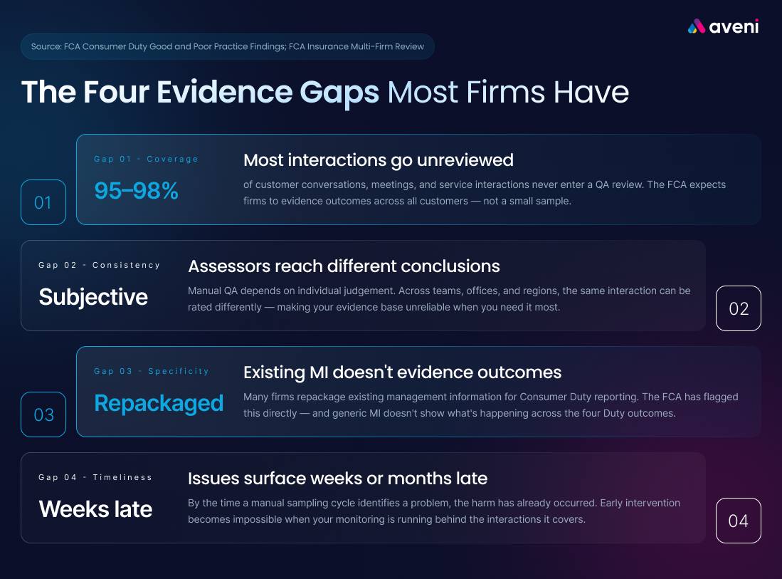 For many firms, the evidence gap is structural. Existing QA and compliance processes were designed for a different regulatory environment, one where sampling a small percentage of interactions, recording completion rates, and responding to complaints was considered adequate.