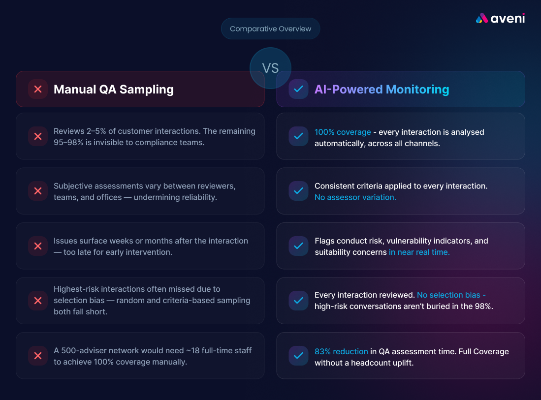 Response time. By the time a manual QA process identifies a pattern (for example, a specific adviser consistently failing to confirm understanding, or a product being recommended without adequate disclosure), multiple customers may already have experienced poor outcomes. The FCA expects firms to act proactively. Retrospective sampling, by its nature, limits a firm’s ability to intervene early.