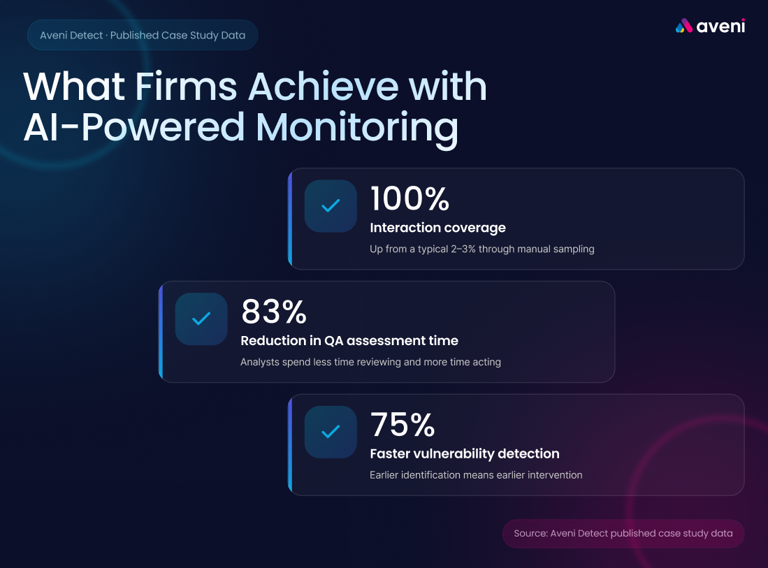 As a reference point, firms using Aveni Detect have achieved 100% interaction coverage (up from typical 2–3% manual sampling), with QA assessment time reduced by 83% and vulnerability detection completed 75% faster. These results are documented in Aveni’s published case studies.