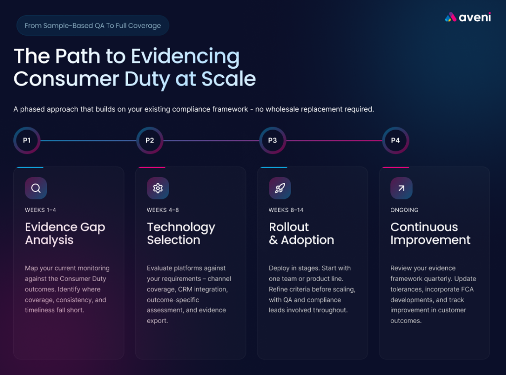 Deploy in stages. Start with a single team, product line, or office to establish baseline metrics and refine assessment criteria before expanding. Incorporate feedback from QA assessors, compliance leads, and frontline staff as you scale. Training should focus on how the technology supports existing QA workflows (not replaces them), and how the evidence it generates feeds directly into Consumer Duty board reporting.